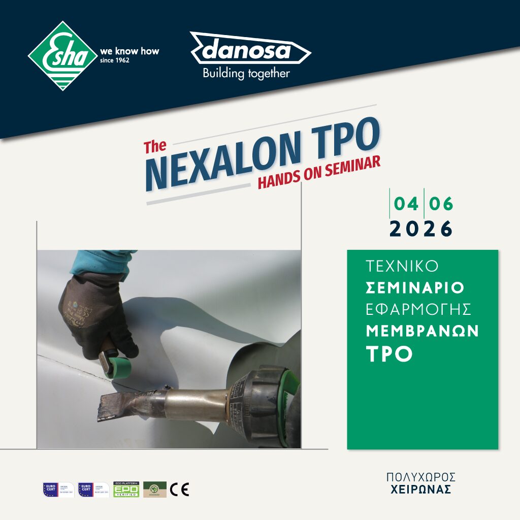 Η Βιομηχανία Ασφαλτικών, Χημικών και Μονωτικών Προϊόντων Esha με συνεχή παρουσία στην ελληνική αγορά από το 1962 διοργανώνει σε συνεργασία με την ισπανική βιομηχανία Danosa ,ένα πρακτικό τεχνικό σεμινάριο για τις μεμβράνες στεγάνωσης TPO (Thermoplastic Polyolefin), μια από τις πιο σύγχρονες και αναπτυσσόμενες τεχνολογίες στεγάνωσης στην Ευρώπη.
